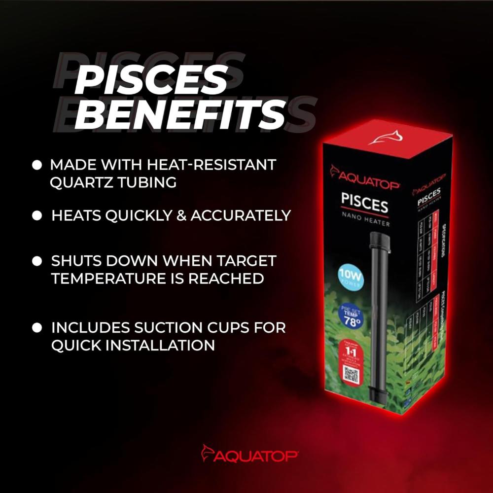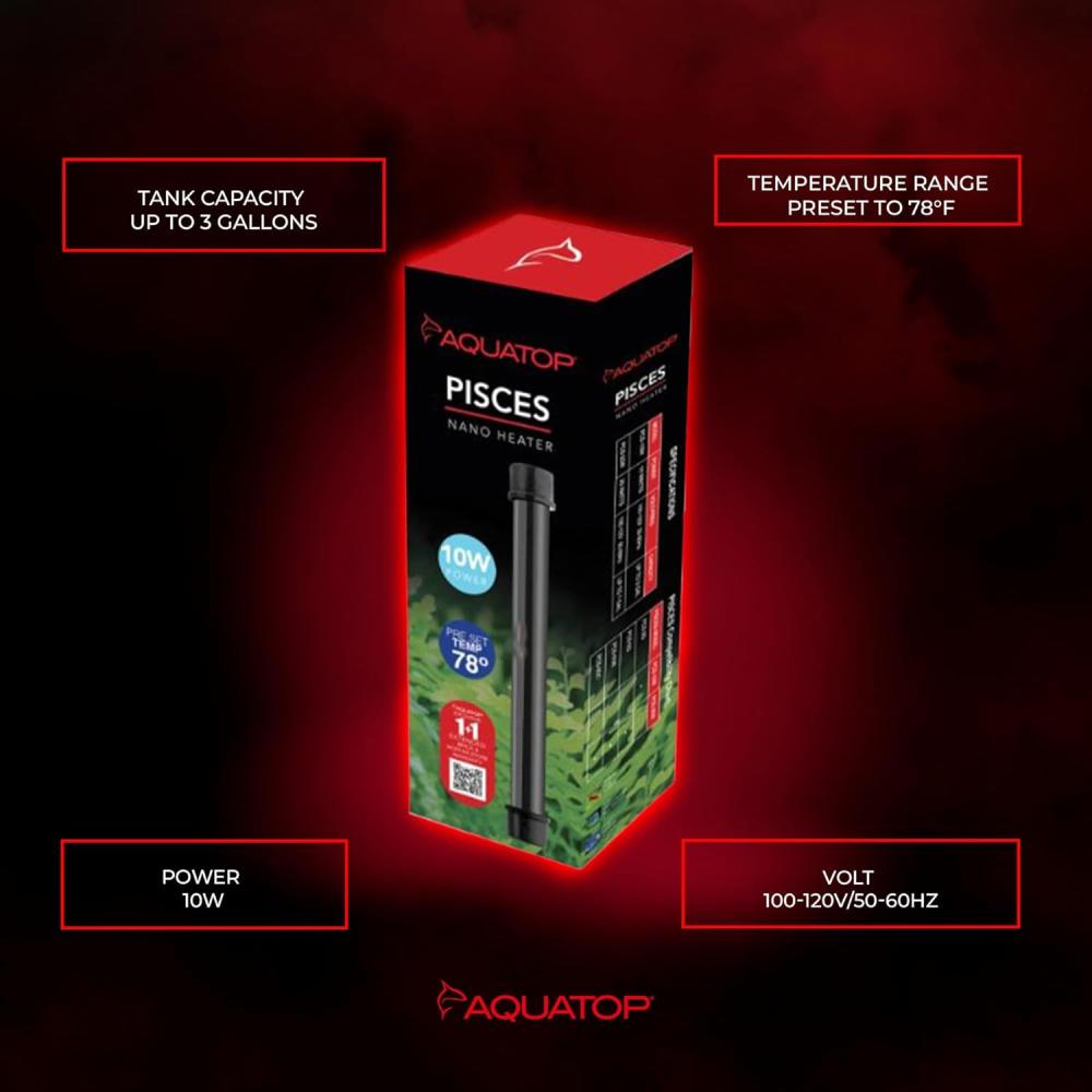 AquaTop's PISCES Nano Aquarium Heaters. The compact design allows for versatile placement in small aquariums such as our PISCES All-in-One Aquariums. Each unit has a built-in electronic thermostat preset to 78? F for precise temperature-controlled accuracy of ±1.8? F. When the target temperature of the heater has been achieved, the unit will shut down and stop heating the water. Constructed from a heat-resistant quartz material, the PISCES Nano Heaters will heat your aquarium water quickly and accurately, plus the included suction cups allow quick and easy installation. May the PISCES Nano Heaters help keep your aquatic creatures warm!