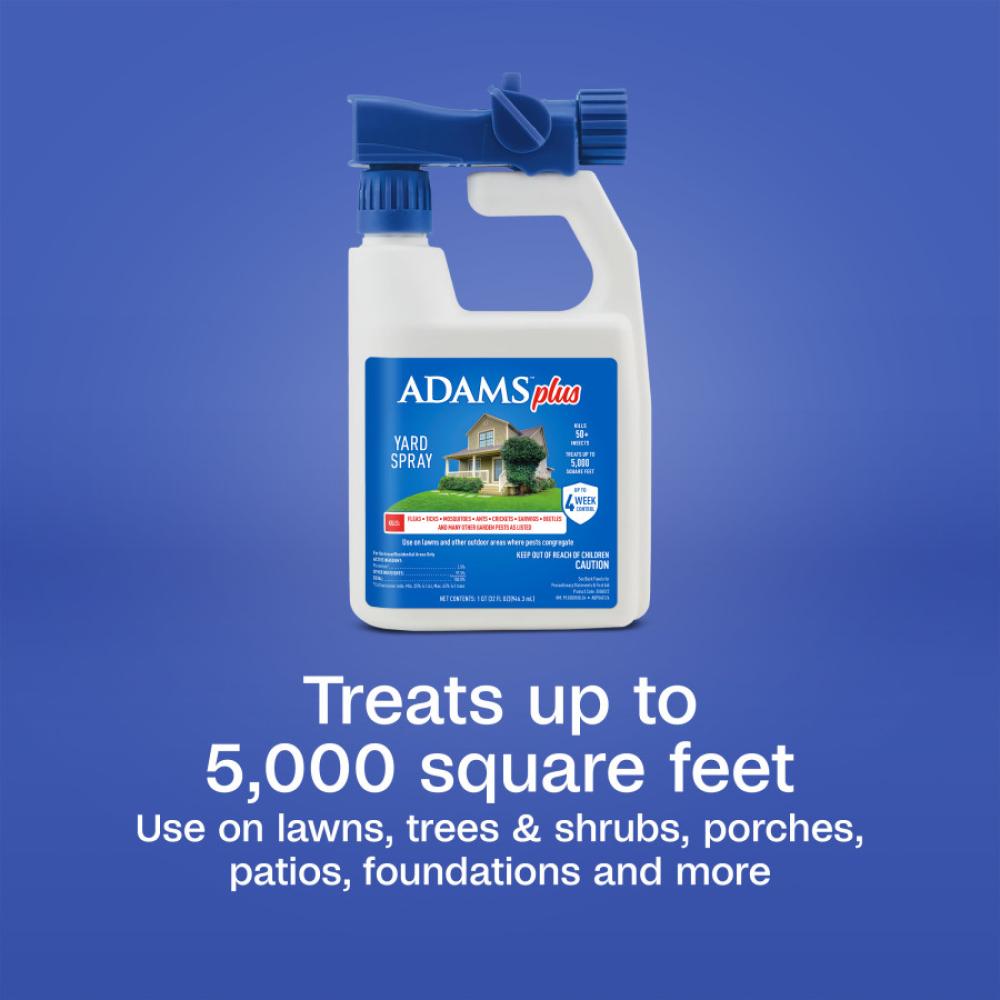 ADAMS Plus Yard Spray targets outdoor pests at the source. This flea and tick yard treatment delivers easy and effective outdoor pest protection for your pets. ADAMS Plus Yard Spray kills fleas, ticks, mosquitoes, ants, Japanese beetles, fire ants, and many other listed insects. This water-based flea and tick outdoor spray contains permethrin, a long-lasting insecticide which provides contact and residual control for up to 4 weeks. The convenient hose-end sprayer makes application easy across your entire outdoor space covering up to 5,000 square feet. This yard spray can be used on lawns, trees, shrubs, porches, patios, foundations and more. Protect your cat or dog from pests in your yard. The best protection you can offer your pet is protecting them and the areas where they live and play. Since only 5% of fleas live on your pet, use this spray with other ADAMS products to protect your pet, home and yard for complete pest control. Since 1975, the people who bring you ADAMS have helped owners confidently care for their pets, ensuring they live happy and healthy lives.