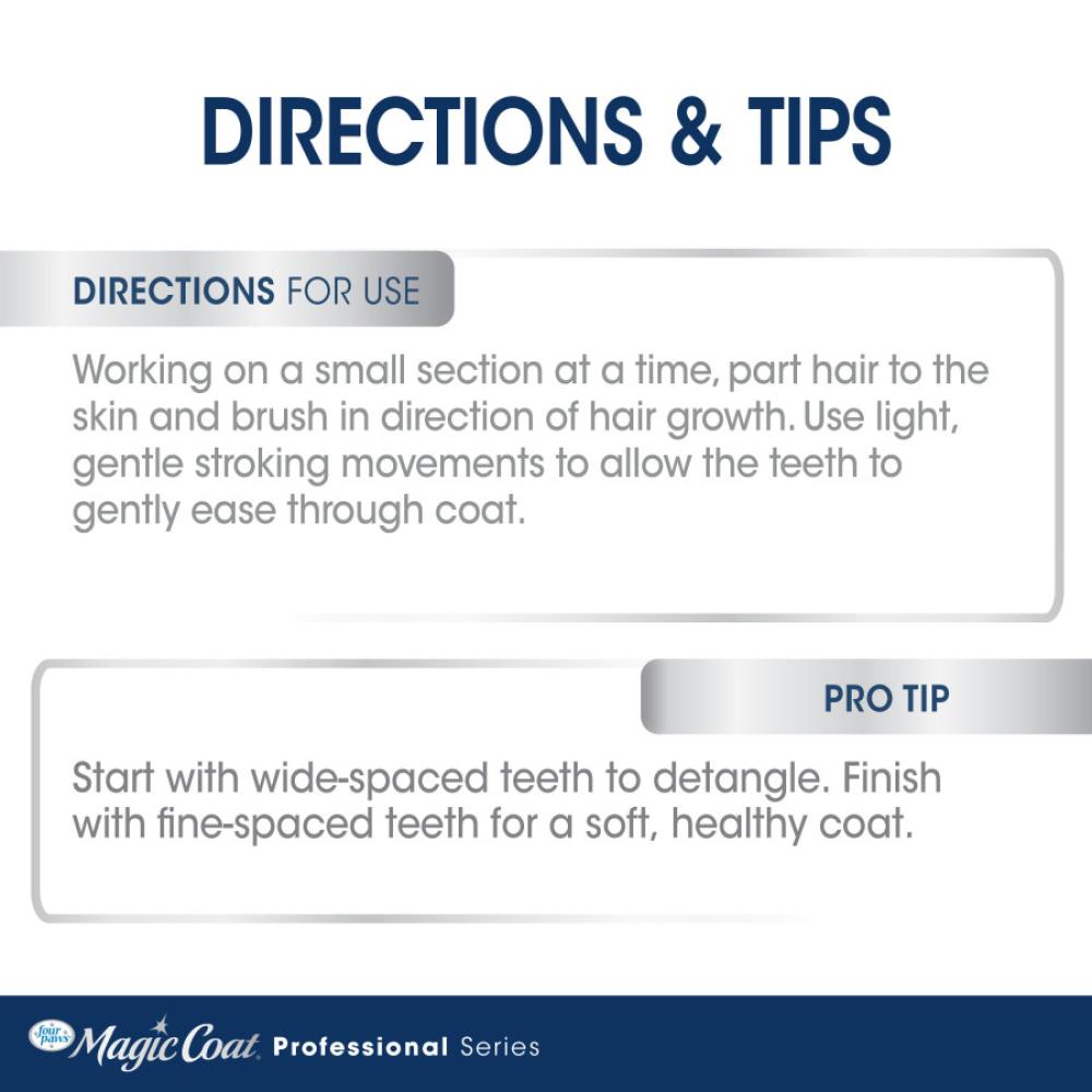Wide-spaced teeth detangle while fine-spaced teeth remove excess hair and lift the coat