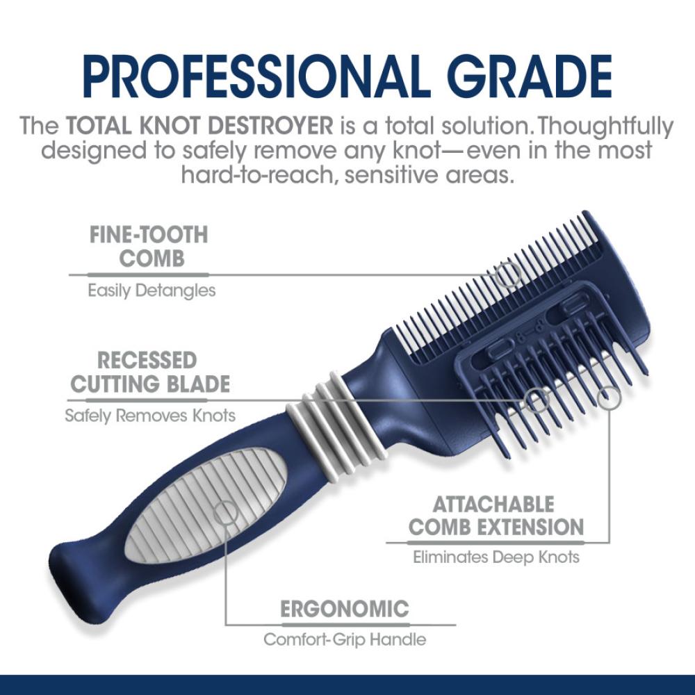The Magic Coat Professional Series features premium multi-purpose pet grooming tools for a salon-like experience right at home. Safely remove stubborn knots and mats with our Magic Coat Professional Series Total Knot Destroyer. This knot comb for dogs is a total solution that was thoughtfully designed to remove any knot—even in the most hard-to-reach, sensitive areas. This multi-purpose dog grooming comb features a recessed cutting blade to thin out excess hair and safely eliminate tough mats and knots. To reach even deeper knots, our dog dematter includes a comb extender for more precise grooming, especially in longer-haired coats! With a handle ergonomically designed for comfort, this pet grooming comb is great for both dogs and cats with medium, long, and curly coats.