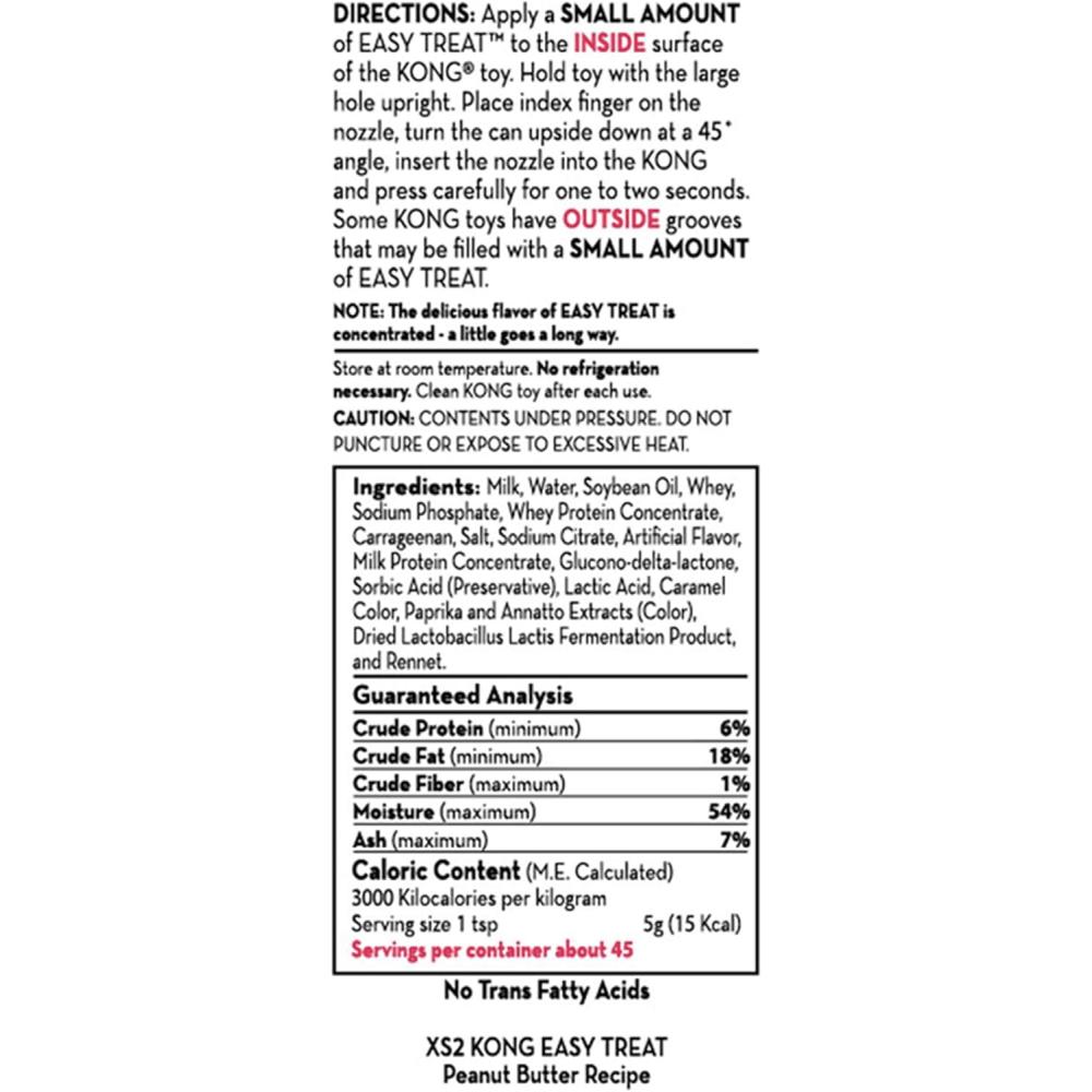 KONG Peanut Butter Easy Treat is a delicious treat that delights all types of dogs while providing an easy no-mess solution for pet parents. Made in the USA, this highly-digestible and trans-fat free treat is an enticingly delicious addition when added to a stuffed KONG. A uniquely designed nozzle easily controls the amount of KONG Easy Treat while also having the added benefit of a convenient, no mess stuffing solution. Want to make your stuffed KONG last longer? Freeze a stuffed KONG, topped with KONG Peanut Butter Easy Treat for a longer-lasting, mind occupying challenge. No Refrigeration required.