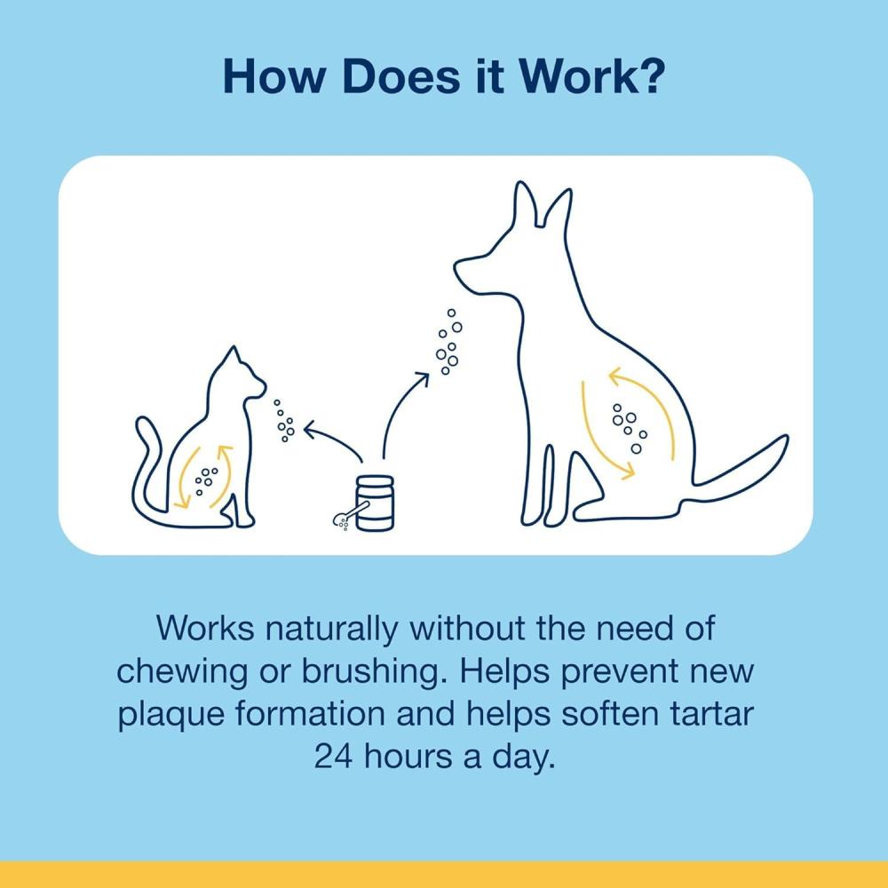 ProDen PlaqueOff Powder is a 100% natural pet food supplement containing the natural and organic kelp ingredient A.N ProDen – shown in clinical trials to help reduce plaque and tartar and to help improve bad breath. The results are usually seen between 3 to 8 weeks, with continued use. Sprinkle the powder over the dog’s ordinary food, wet or dry, once a day with the supplied scoop. For a 10kg dog, a 60g bottle lasts roughly 6 months.