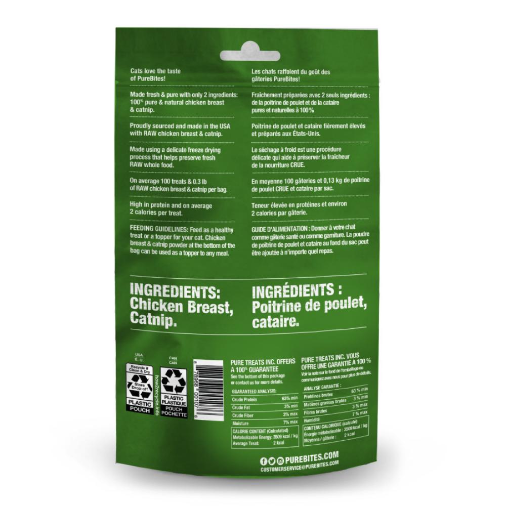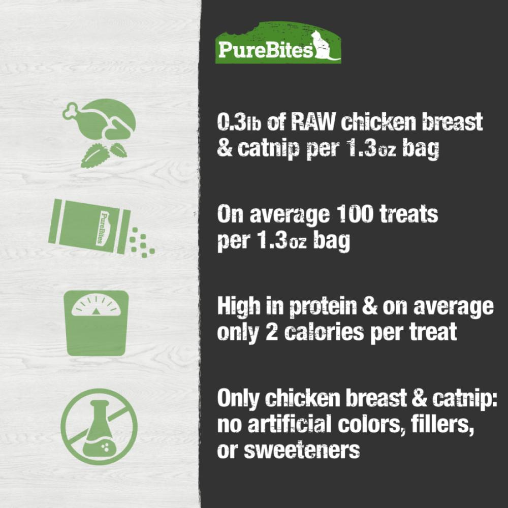 Go ahead, turn the bag around and look at our ingredients. Made with only 2 ingredients; 100% Pure & Natural USA Raised Chicken Breast & USA Grown Organic Catnip. Cats love the taste of PureBites® because our treats are freeze dried RAW to lock in the aroma, texture and freshness they crave. Cat parents love PureBites® because our treats are 100% pure and rich in nutrients for a happy and healthy life.