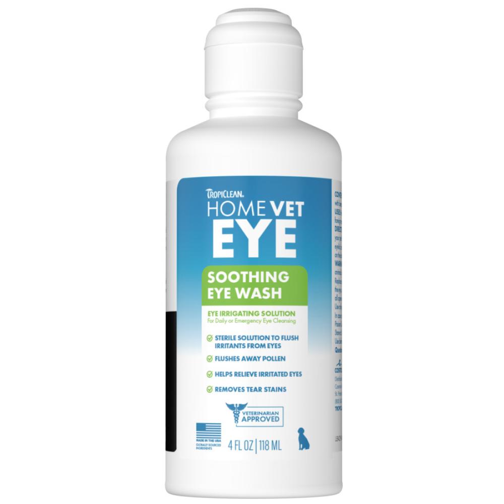 TropiClean HomeVet Soothing Eye Wash clears eyes of irritants and itching. Our gentle formula also provides safe, sting-free cleaning of eye crust and tear staining for dogs and cats.