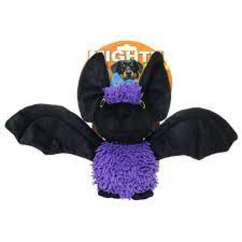 Mighty® Microfiber Ball Purple Bat Halloween Holiday Dog Toy - Minimal Stuffing! Squeaker balls replace most of the stuffing in the body. Soft edges won't hurt gums. Machine washable (air dry) and it floats! These toys may seem plush on the outside, but all the durability features are internal making them soft, yet Mighty® strong.