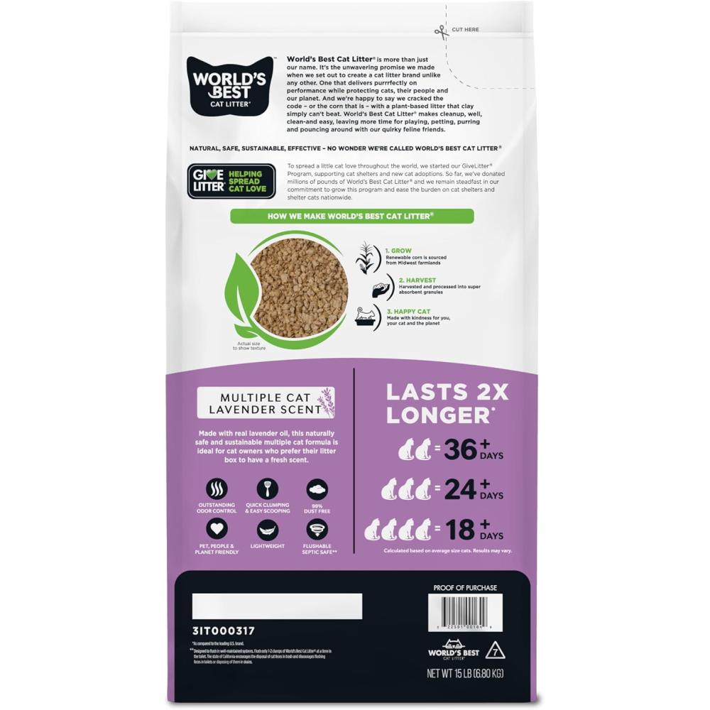 The World's Best Cat Litter Multiple Cat Lavender Scented formula harnesses the power of naturally absorbent corn with natural lavender oil for cat owners who prefer their cat litter to be scented. Utilizing naturally absorbent corn, this formula delivers 2X longer lasting performance than the leading US litter brand. This naturally safe solution allows cat lovers like you to smell less, clean less and buy less.