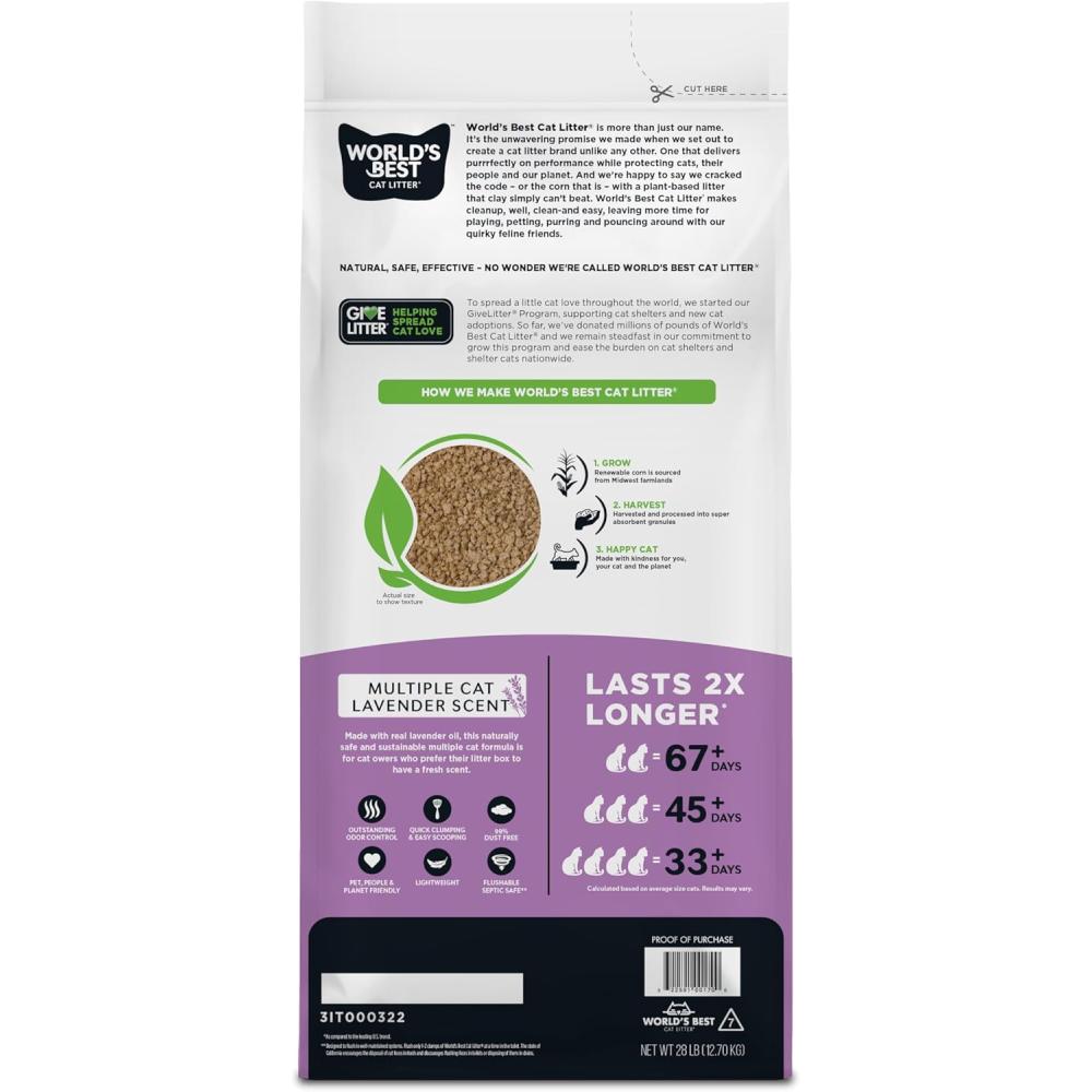 The World's Best Cat Litter Multiple Cat Lavender Scented formula harnesses the power of naturally absorbent corn with natural lavender oil for cat owners who prefer their cat litter to be scented. Utilizing naturally absorbent corn, this formula delivers 2X longer lasting performance than the leading US litter brand. This naturally safe solution allows cat lovers like you to smell less, clean less and buy less.
